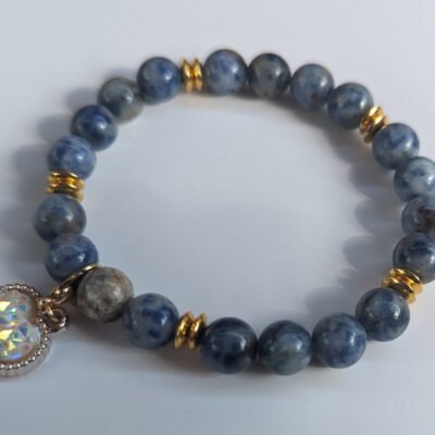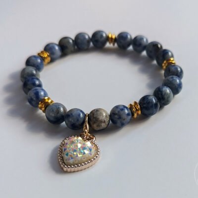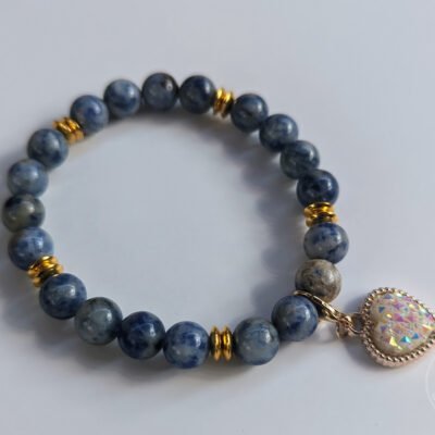 Bracelet en pierre de Sodalite avec perles d’espacement rondes en or et une belle breloque en forme de cœur montées sur un fil élastique.