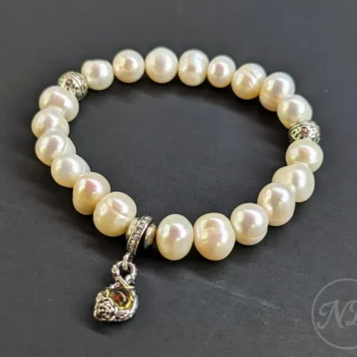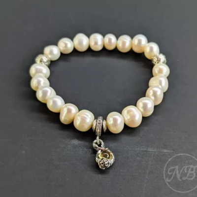 Le bracelet en perles d’eau douce avec breloque Pandora en forme de huit infinis montées sur un fil élastique. Ce bracelet fait à la main est une pièce de bijouterie délicate et charmante.